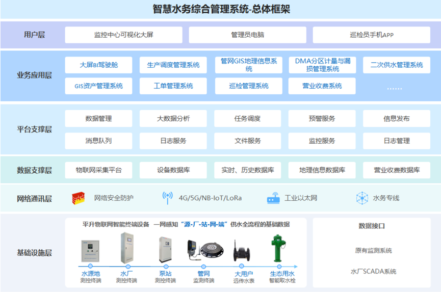 系统包含大屏BI驾驶舱、智慧供水生产调度管理、管网GIS地理信息系统、DMA分区计量与漏损管理、二次供水监控管理、工单管理、巡检管理、营业收费管理等子系统,帮助水司实现供水运营管理的信息化、自动化、智慧化,优化生产调度,保障供水安全,提升运维效率,降低管网漏损,促进节能降耗,降低水司产销差,提升企业管理效率与服务水平。